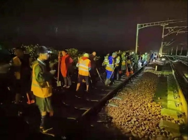 ▲截至7月21日10时,中国通号电气化局共有约680余名员工冒雨先后在陇海线、京广线、郑西高铁等水害现场,组织16台大型抢险机械,通过对线路抛填片石、清理坍体、打桩堆码编织袋、回填陷穴等措施,对线路、供电、接触网、信号等设备进行抢修,确保线路安全。
