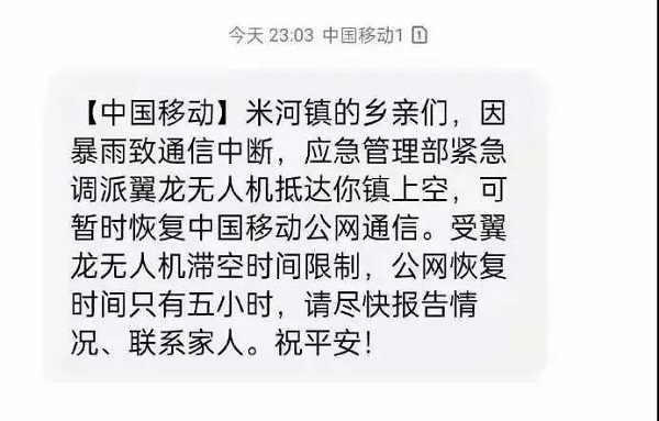 ▲“翼龙”-2H应急救灾型无人机系统是航空工业打造的应急通信国家力量,可定向恢复50平方公里的移动公网通信,建立覆盖15000平方公里的音视频通信网络。针对灾区 “三断”情况,通过融合空中组网、高点中继等技术,实现图像、语音、数据上下贯通横向互联。翼龙-2H应急救灾型于下午14:22从安顺机场起飞,在河南上空执行这个五到六小时的侦察和中继任务。18:21进入任务区。当“翼龙”在头顶飞过,为乡亲们搭建通信“生命线”!