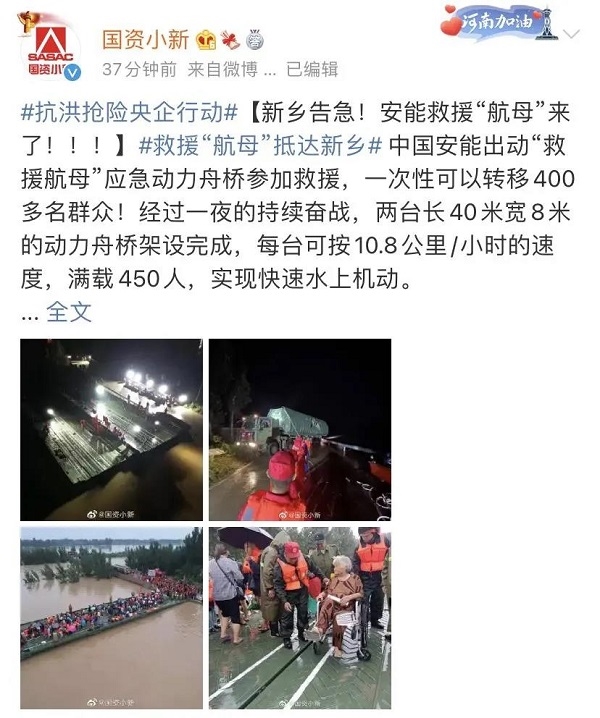 7月23日12时,由中国安能调派的两台动力舟桥,累计救援新乡1400多名被困群众,共转移7个批次。