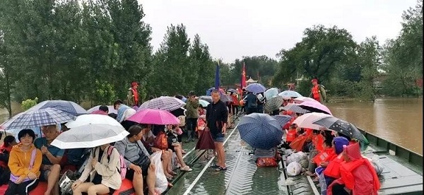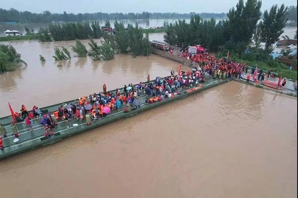 7月23日8时,被困群众乘坐动力舟桥前往安全地带。动力舟桥长40米、宽8米,可按10.8公里/小时的速度,满载450人,实现快速水上机动。