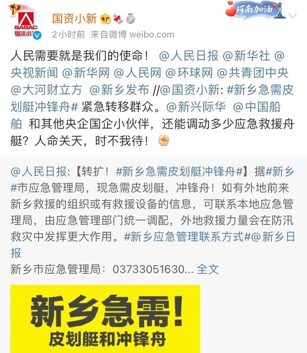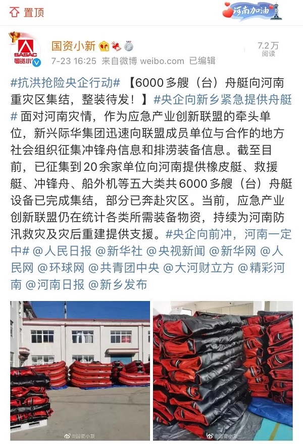 在看到“新乡急需皮划艇冲锋舟”消息后,新兴际华集团作为应急产业创新联盟的牵头单位,迅速向联盟成员单位与合作的地方社会组织征集冲锋舟信息和排涝装备信息。