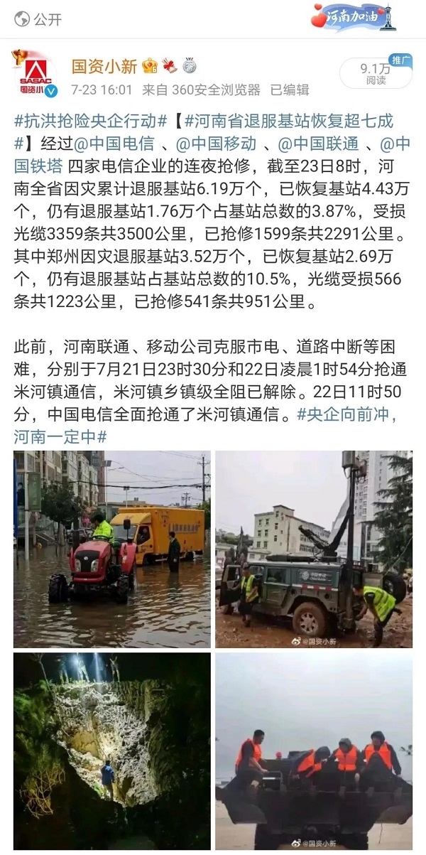 截至7月23日16时,河南郑州主城区此前断电退服的2312个基站中,除32个基站因机房被淹、机柜进水存在安全隐患等原因尚不具备发电条件外,其余2280个基站已通过油机发电等紧急方式,全部恢复通信。目前郑州主城区公众通信基本畅通,运行平稳。