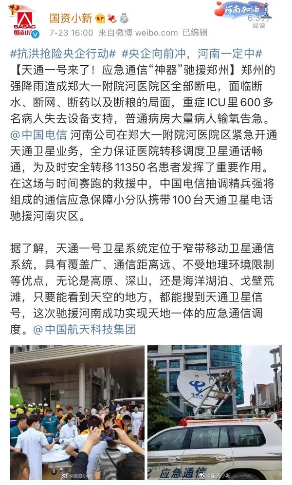受持续强降雨影响,河南省郑州市单日降雨量突破历史极值,这场强降雨造成郑大一附院河医院区全部断电,且面临断水、断网、断药以及断粮的局面,几十台手术被迫中断。中国电信河南公司在郑大一附院河医院区紧急开通天通卫星业务,全力保证医院转移调度卫星通话畅通,为及时安全转移11350名患者发挥了重要作用。