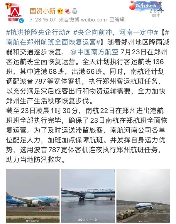同时,南航集团还计划调配波音787等宽体客机,执行郑州客运航班任务,以充分满足灾后旅客出行和物资运输需要,全力加快郑州生产生活秩序恢复步伐。