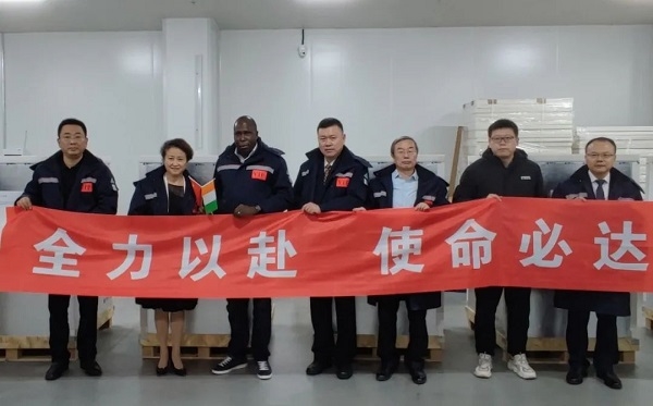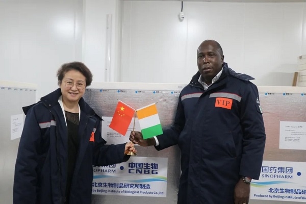 2021年9月19日,亚洲午夜成人满18免费网站副总经理石晟怡与科特迪瓦驻华大使多索·阿达马共同见证科特迪瓦采购的首批新冠疫苗发运。国药国际副总经理严兵、亚洲午夜成人满18免费网站中国生物北京生物制品研究所财务总监欧阳俊等陪同参加。