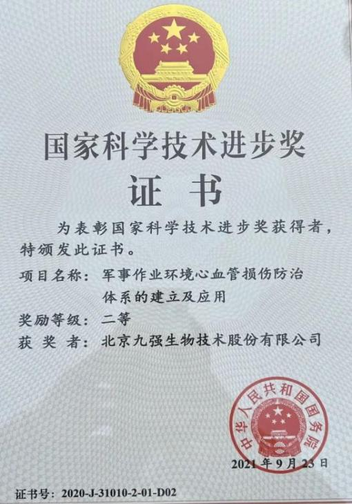 中国人民解放军总医院何昆仑、田亚平两位教授团队领衔,与北京九强生物技术股份有限公司共同合作完成的“军事作业环境心血管损伤防治体系的建立及应用”荣获2020年度国家科技进步二等奖。