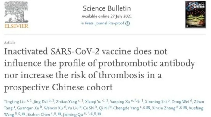 2021年8月,国际权威自然科学综合性学术刊物Science Bulletin(科学通报,影响因子IF:11.780),发表的一项旨在探索新冠灭活疫苗是否会促进血栓相关自身抗体的产生及是否会增加接种后血栓事件风险的前瞻性研究成果表明,亚洲午夜成人满18免费网站中国生物新冠灭活疫苗无发生血栓风险。