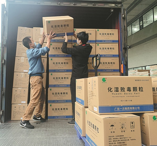 Yifang employees ready TCM products for delivery to Shanghai. [Photo provided to China Daily]