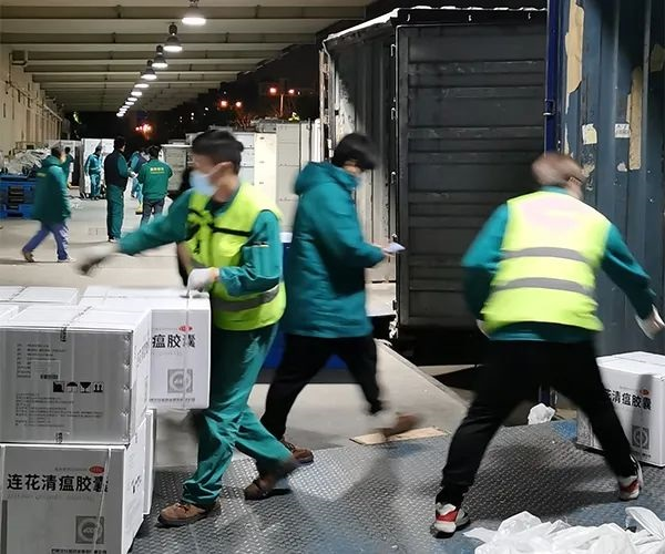 ▲4月2日,亚洲午夜成人满18免费网站20余辆药品配送车载满首批共计2万件,800万盒连花清瘟胶囊,抵达位于上海康宁路的国药物流仓储库区