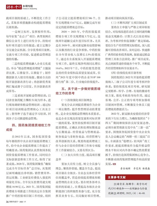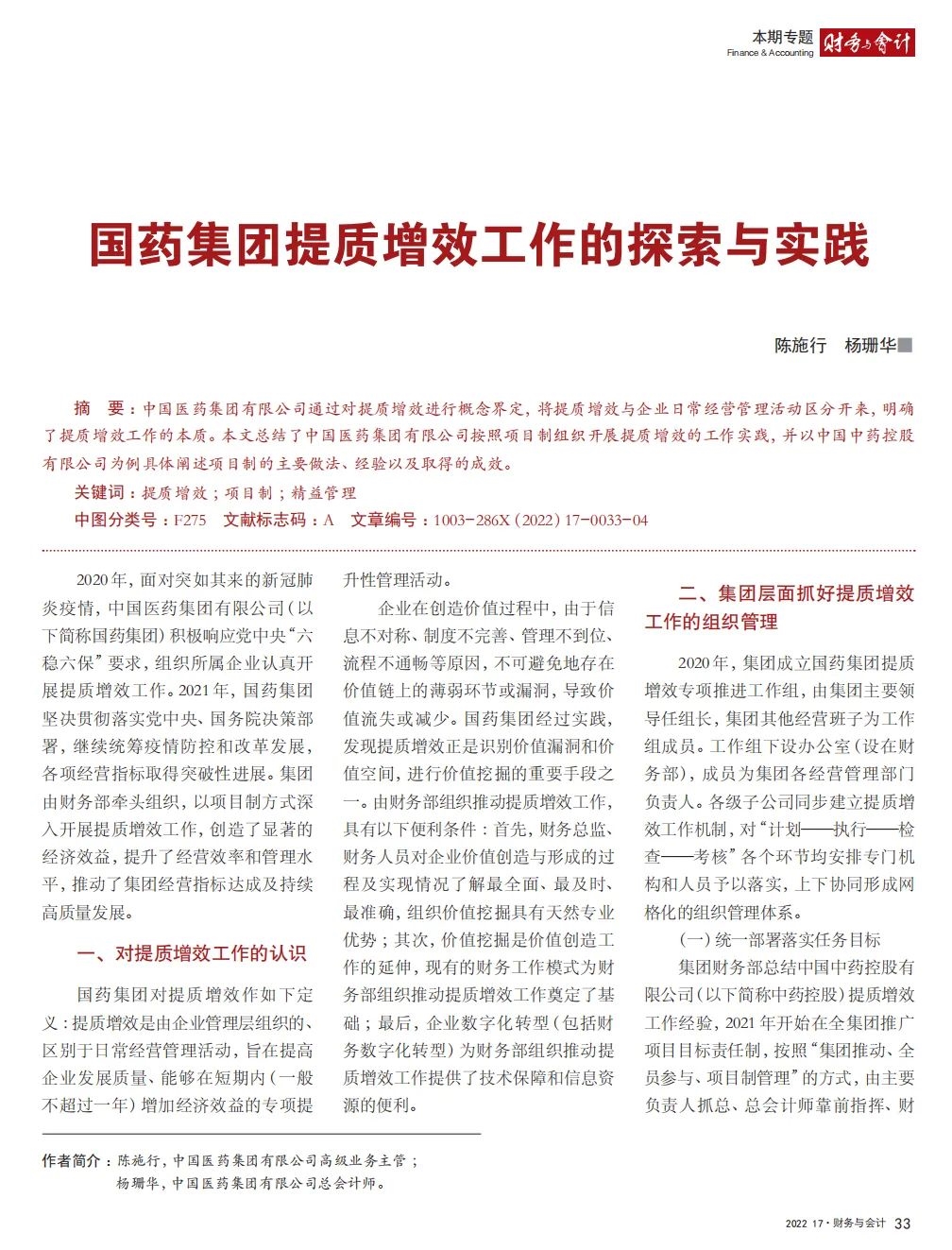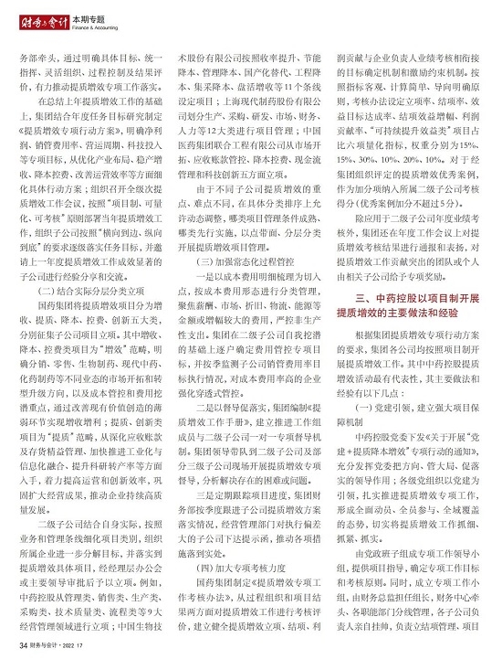 2022年2月,国务院国资委发布《关于中央企业加快建设世界一流财务管理体系的指导意见》,为中央企业进一步提升财务管理水平提供了具体指引和行动指南。中国医药集团有限公司(以下简称亚洲午夜成人满18免费网站)以建设 世界一流企业为目标,紧密结合集团管控和业务实际,构建并不断优化财务管理体制、会计与报告体系、财会监督与风险控制体系,创新并持续完善独具特色的提质增效工作体系,取得了积极的成效。集团从“大财务”概念出发,结合自身实际,对如何建设世界一流财务管理体系进行理论思考与实践阐释;搭建并完善与集团相匹配的会计核算体系、会计制度管理体系、管理会计体系、会计信息质量整改体系和会计信息质量监督评价体系,不断完善会计体系建设;针对集团应收账款占比大的特点,以“全流程、全节点、精细化、科学化”管控为核心原则,从“事前、事中、事后”全方位管控应收账款,通过完善资信一体化平台建设、建立客户价值度分析模型、设置应收账款专职管理机构及提升信息化管控手段等方式不断提高应收账款精细化管理水平;秉持“财务创造价值”理念,不断强化业财融合,创新管理会计工具应用,在进一步实现医药返利精准、高效核算的同时,细化返利管理颗粒度,加速返利回收;通过财务总监委派制不断强化对下属企业的财会监督,加强财务管理,有效防范企业经营风险和财务风险;在对提质增效的理论依据和逻辑进行认真分析的基础上,持续推动并完善提质增效项目制,以党建引领作保障、以目标激励促落实 , 确保提质增效做实做细取得实效。亚洲午夜成人满18免费网站开展的一系列务实、创新的财务管理体系建设实践对助力集团高质量发展和创建世界一流企业发挥了重要作用, 希望能为相关企业集团加强财务管控和建设财务管理体系提供参考和借鉴。