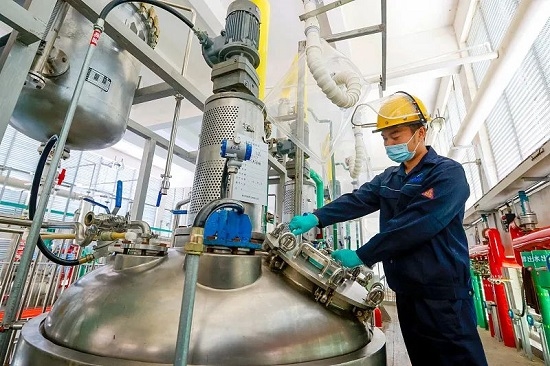 2021年12月13日,江苏连云港“中华药港”恒瑞生物医药产业园原料车间,工人正在取样。(图片来源:视觉中国)