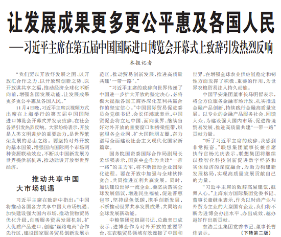 11月4日晚,习近平主席以视频方式出席在上海举行的第五届中国国际进口博览会开幕式并发表致辞,在社会各界引发热烈反响。大家纷纷表示,开放是人类文明进步的重要动力,是世界繁荣发展的必由之路。要坚持对外开放的基本国策,增强国内国际两个市场两种资源联动效应,不断以中国新发展为世界提供新机遇,推动建设开放型世界经济。