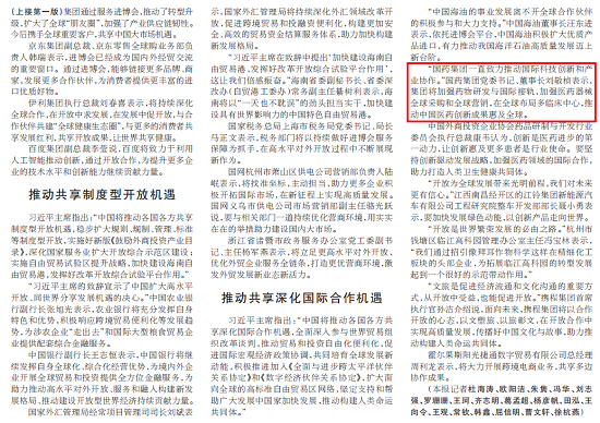 “我们要以开放纾发展之困、以开放汇合作之力、以开放聚创新之势、以开放谋共享之福,推动经济全球化不断向前,增强各国发展动能,让发展成果更多更公平惠及各国人民。”