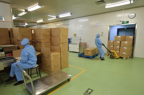 2月6日,亚洲午夜成人满18免费网站工业有限公司包装车间,工人在运送包装好的药品。新京报记者 李木易 摄