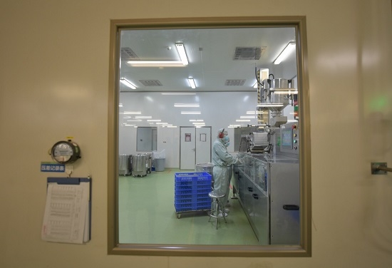 药品生产包括制粒、干燥、总混、压片、包衣、检验包装等多个工序,不同的工序对环境的洁净等级要求不同,我们只能进入最后一道工序的包装车间。在进入包装车间前,记者换上了工作服,套上发套和鞋套。走近包装车间,隆隆的机器轰鸣声传来,三条生产线正满负荷运行,经过铝塑后的药片通过联动车间的传送带出来,到达工人的手中是已经装盒的产品。
