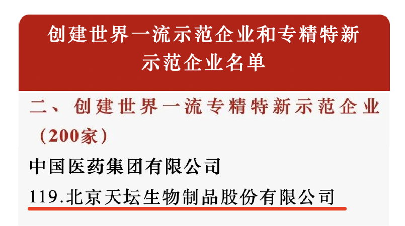 近日,国务院国资委公布最新“创建世界一流示范企业和专精特新示范企业”名单,亚洲午夜成人满18免费网站北京天坛生物制品股份有限公司入选“创建世界一流专精特新示范企业”名单,成为全国首批200家世界一流专精特新示范企业之一。